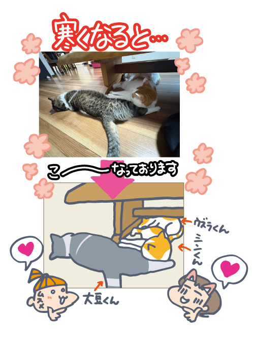 そうなると猫3匹はこ〜んなかんじで集まってきてくれるのだが、、、、